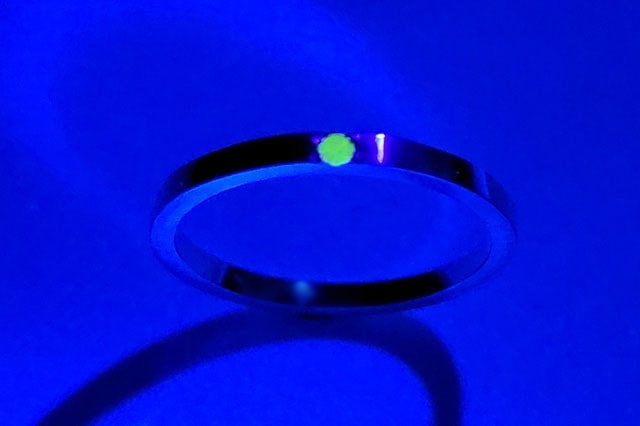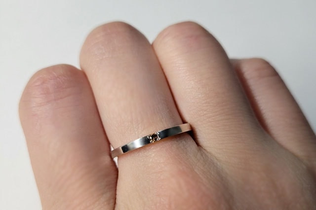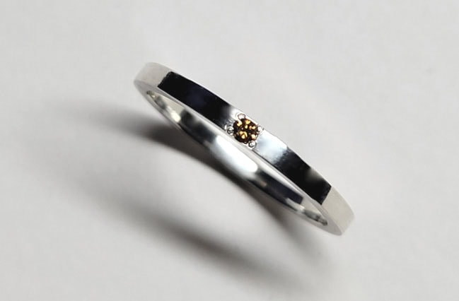 ブラウンダイヤモンドリング 価格:¥22,000(税込)素材:シルバー925、ブラウンダイヤモンドサイズ:幅1.7mm、厚み1.4mm号数:12号 ブラウンダイヤモンドを一粒あしらったシルバーリング。 どんなスタイルにも合わせやすいシンプルなデザインです。 小ぶりながら存在感があるダイヤモンドは、ブラックライトを当てるとグリーンに蛍光します。