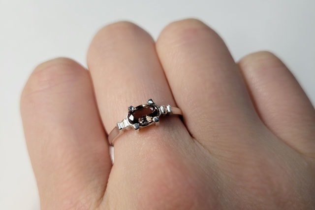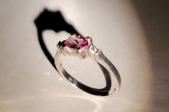 ガーネットリング 価格:¥25,300(税込)素材:シルバー925、ガーネットサイズ:幅1.7~2.0mm、厚み3.5mm石サイズ:6×4mm号数:11号 石が引き立つ様、肩部分に装飾を施したデザインのリングです。 留められているガーネットは、蛍光灯や太陽光の下では落ち着いた雰囲気のブラウンに、白熱灯の元では鮮やかなピンクにカラーチェンジします。